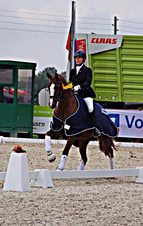 Die 6 j Bellissimo/ Florestan Stute mit dem schönen Namen Bella Colori, was ihre Farbgebung genau trifft, hatte heute in Bielefeld auf dem Turnier der Reitanlage Hollmann-Raabe 2 Top Starts. In Dressurpferde L gewann die bunte Fuchsstute mit den 4 hochweißen Beinen unter Katrin Bettenworth mit der Wertnote von 7,7. Einzelnoten: Trab 8, Schritt 7,5, Galopp 7,5, Dur...chlässigekeit 8, Gesamteindruck 7,5. In dieser Prüfung wurde zusätzlich Stallkamerad Dance with me , 5j von Diamond Hit, an 2. Stelle platziert mit einer Wertzahl von 7,4. Dann folgte die Dressurpferde M, für Bella der erste Auftritt in dieser Klasse und es war ganz einfach, je schwerer, desto besser wird die eifrige Stute. Sieg mit 8,1, Trab und Schritt 8, Galopp und Gesamteindruck 8,5 und nur die Durchlässigkeit war unter 8, nämlich 7,5! Eine tolle Stute mit ganz viel Perspektive. Nun hat sie alles erreicht, was eine 6j erreichen kann und jetzt konzentrieren wir uns auf die kommenden Aufgaben des nächsten Jahres.